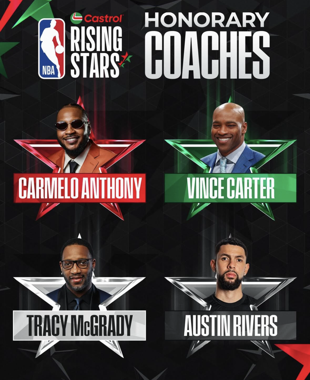 今年的全明星新秀挑战赛赛制和去年相同,NBC四位常驻解说嘉宾安东尼、卡特、麦迪、小里弗斯作为主教练,四人将分别带领三支新秀+二年级球员组成的球队以及一支G联赛(发展联盟)球队进行迷你锦标赛。首轮先得40分的一方晋级,而决赛则是先得到25分的一队夺冠。